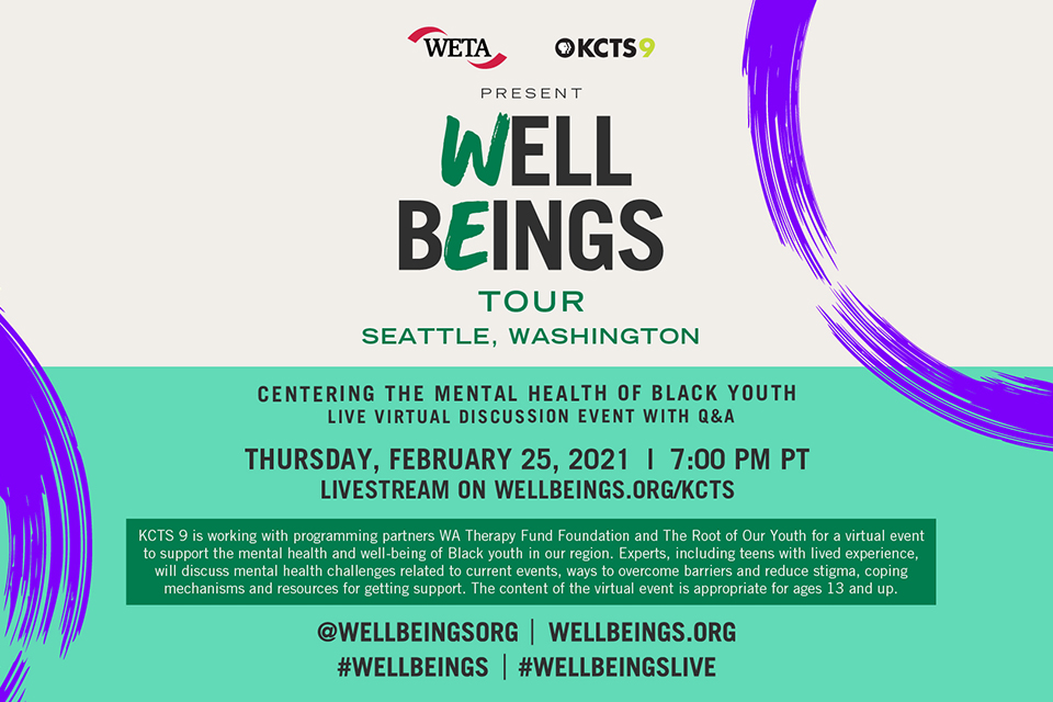 As a part of the national Well Beings initiative, KCTS 9 is working with programming partners WA Therapy Fund Foundation and The Root of Our Youth for a virtual event to address youth mental health and well-being. The event will center and support Black youth as they continue to build their power, and the friends, family and community that surround them. We’ll hear from national and local organizations and individuals who are addressing the mental health needs of Black youth every day. We will discuss barriers, reducing stigma and successful strategies for mental health and well-being within the Black community, featuring the testimony of teens and young adults with lived experience.